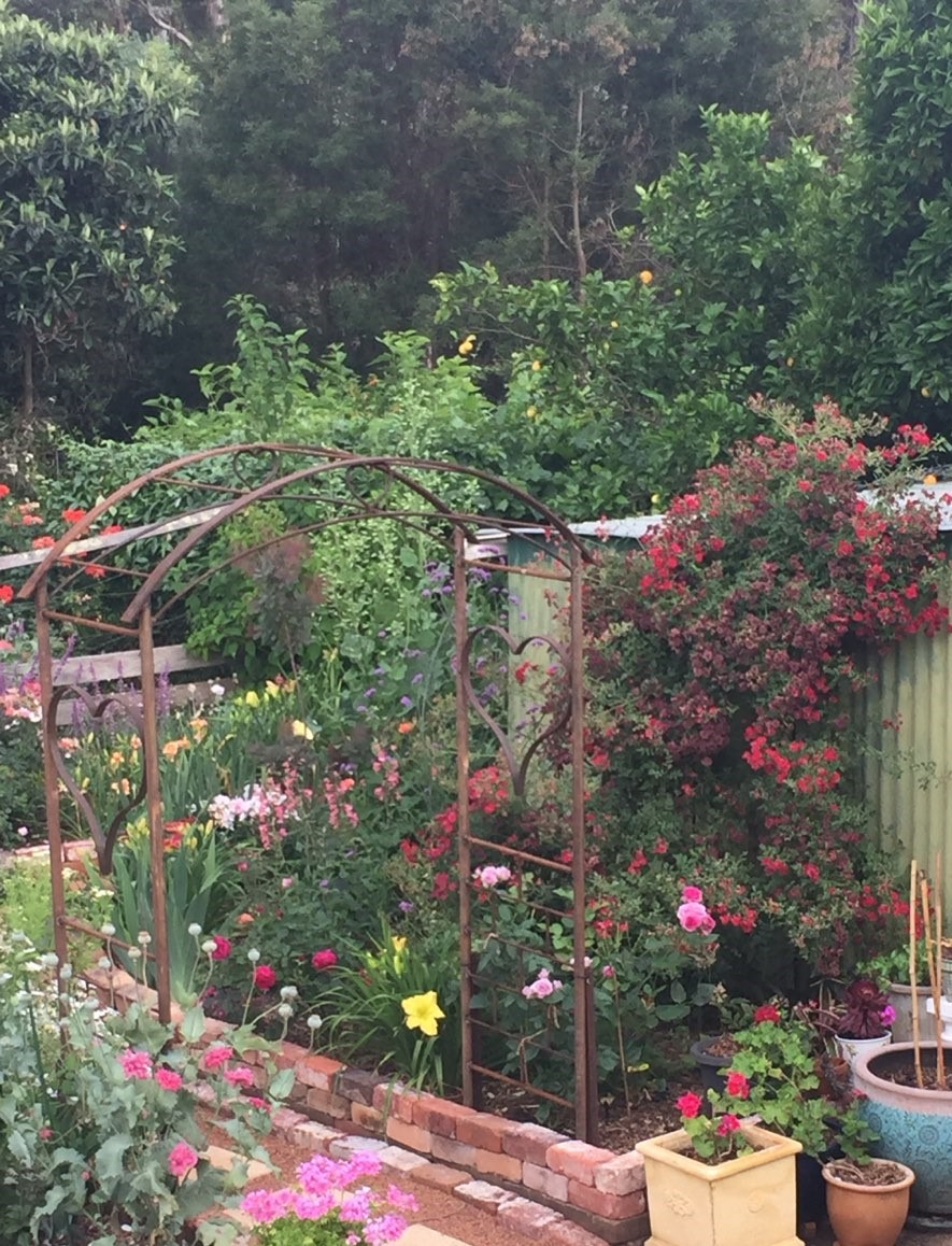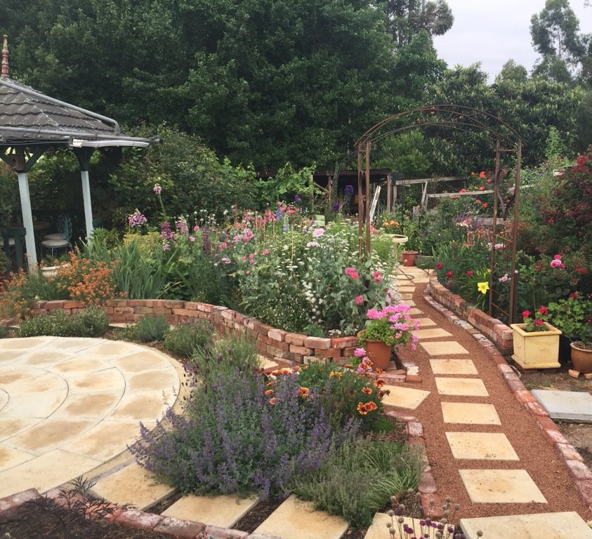 A small romantic cottage garden. We moved into a 125 years old stone cottage with a depleted garden 3 years ago and replaced the lawn with a cottage garden including roses, day lilies, perennials, annuals, natives, vegetable wicking beds, ancient grape vines and fruit trees.